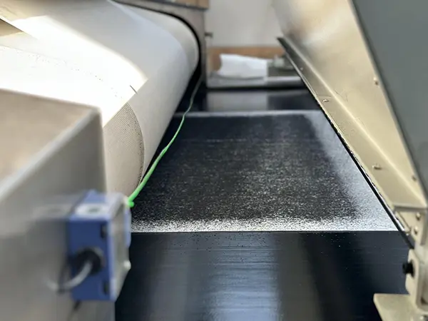 Hot Melt Powder Scatter Lamination process mainly involves evenly scattering hot melt powder on the carpet/mat/interlining through the combination of powder roller, knives, and sieves. After spreading hot melt powder on the base material, the hot melt powder is dried in an oven until it is in a molten state, and then pressed together with face material to form a laminated product.